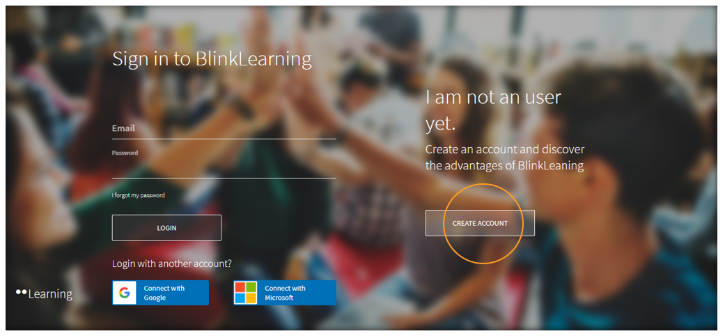 Access https://www.blinklearning.com from your web browser and click on LOGIN if you have an account to introuced your user and password, or click on CREATE ACCOUNT if you are not a BlinkLearning user yet.