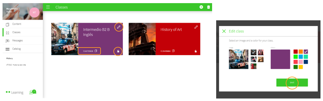 Once you have created the class, you can edit and customise it by clicking on the pencil. You can also copy the code to send it to your students, or close the lock so that no one else can join your class.