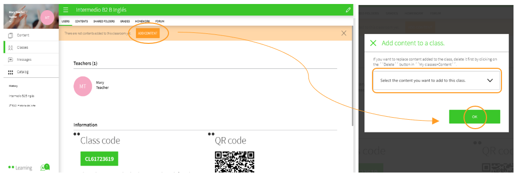 Before sending the code to your students, you will need to add content to your class. Click on ADD CONTENT , select the book in the drop-down menu and click on OK .