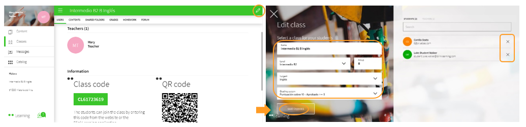 You can edit class information at any time by clicking on the pencil. Here, you can delete students who have joined by mistake by clicking on the X and then SAVE CHANGES .
