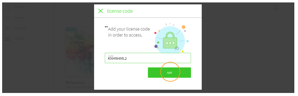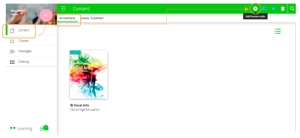 If you have new licence codes, you can add them to your profile at any time. To do so, go to the Content section, in the MY CONTENTS tab, and click on the + Add Licence Code button in the navigation bar.