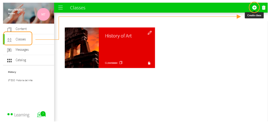 To invite your students to a class using a code, go to the Classes section and click on the + CREATE CLASS button in the top navigation bar.